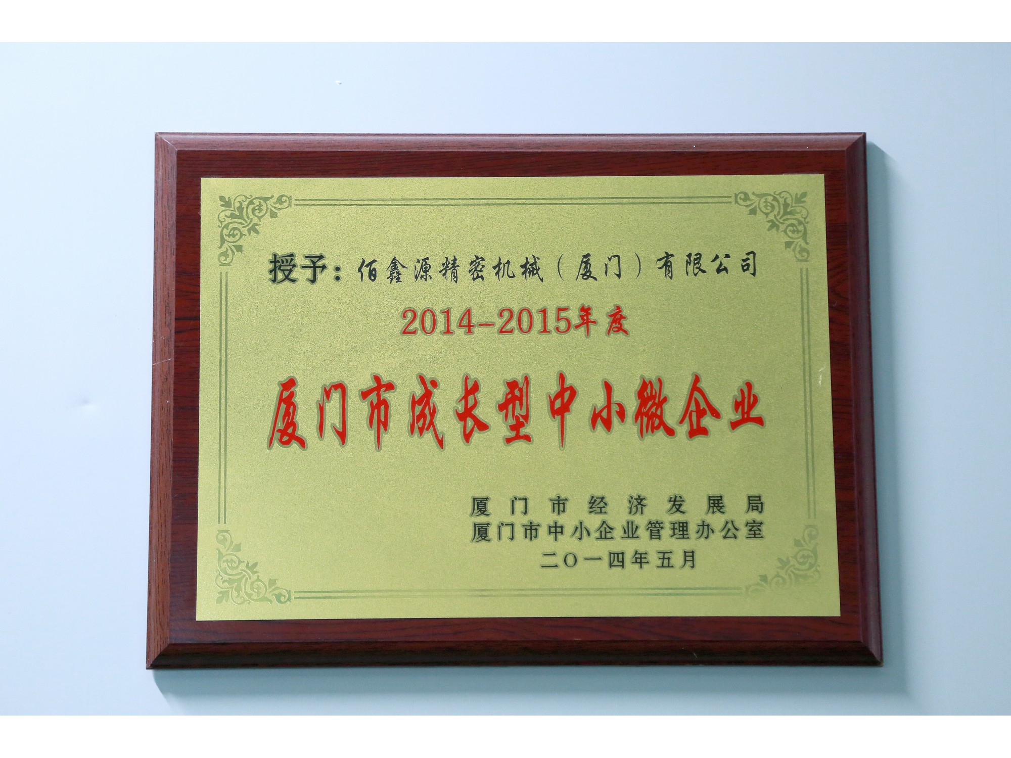 ●2014年5月佰鑫源公司获厦门市成长型中小微企业牌匾