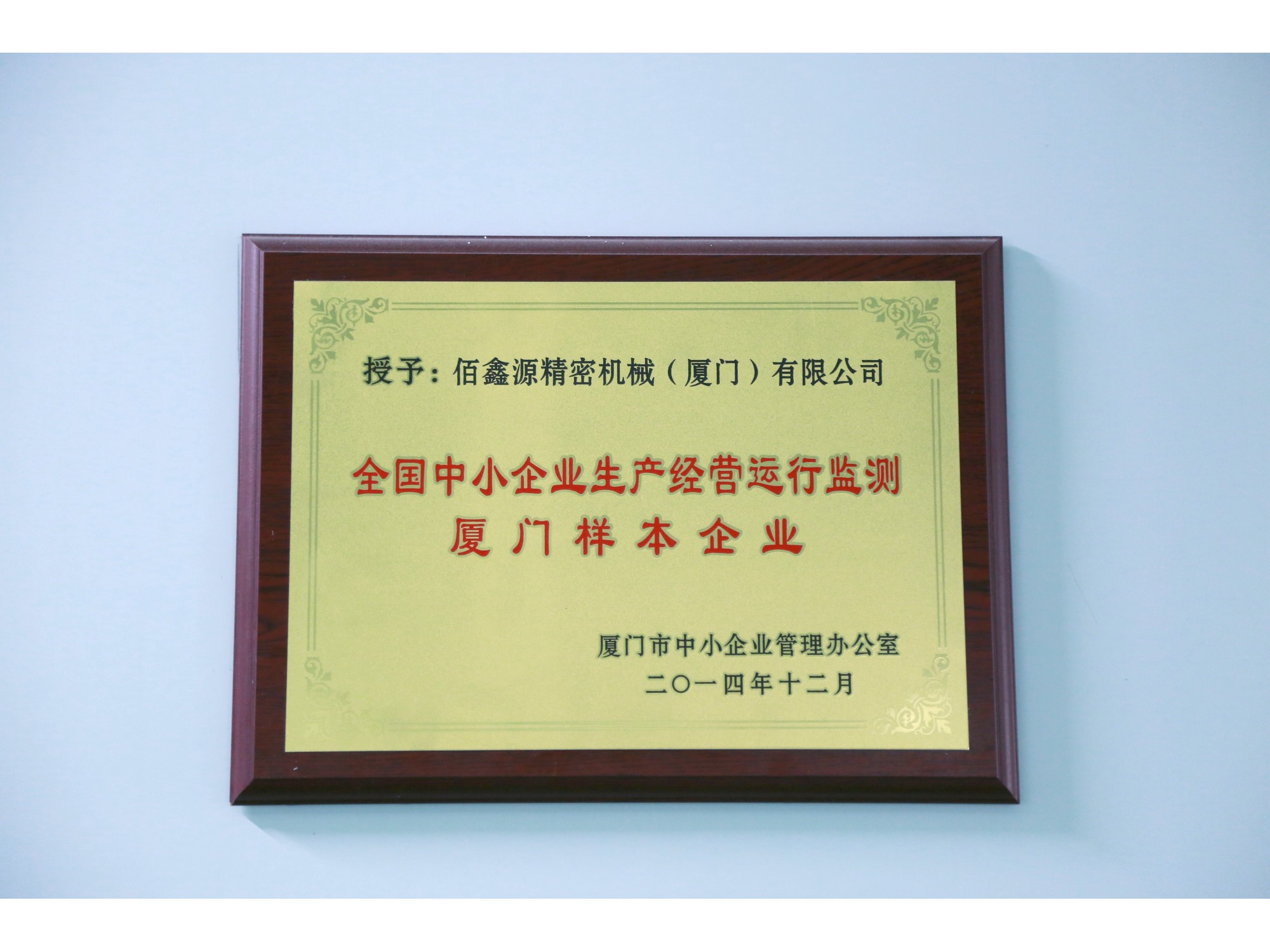 ●2014年12月佰鑫源公司获全国中小企业生产经营运行监测厦门样本企业牌匾
