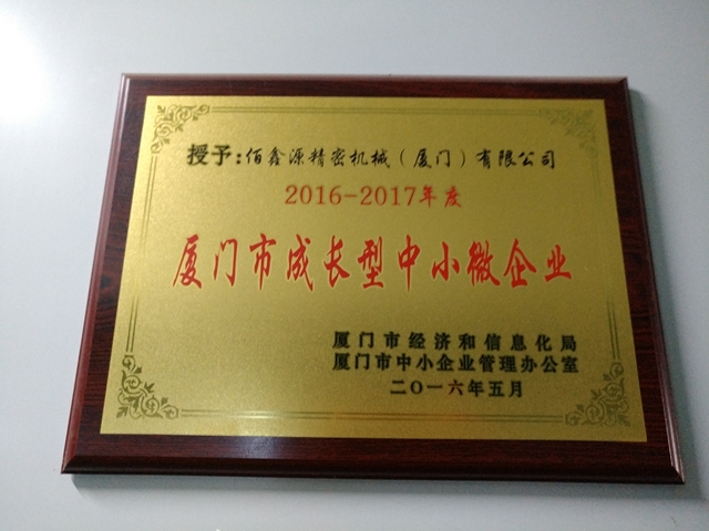 ●2016年5月佰鑫源公司获厦门市成长型中小微企业牌匾