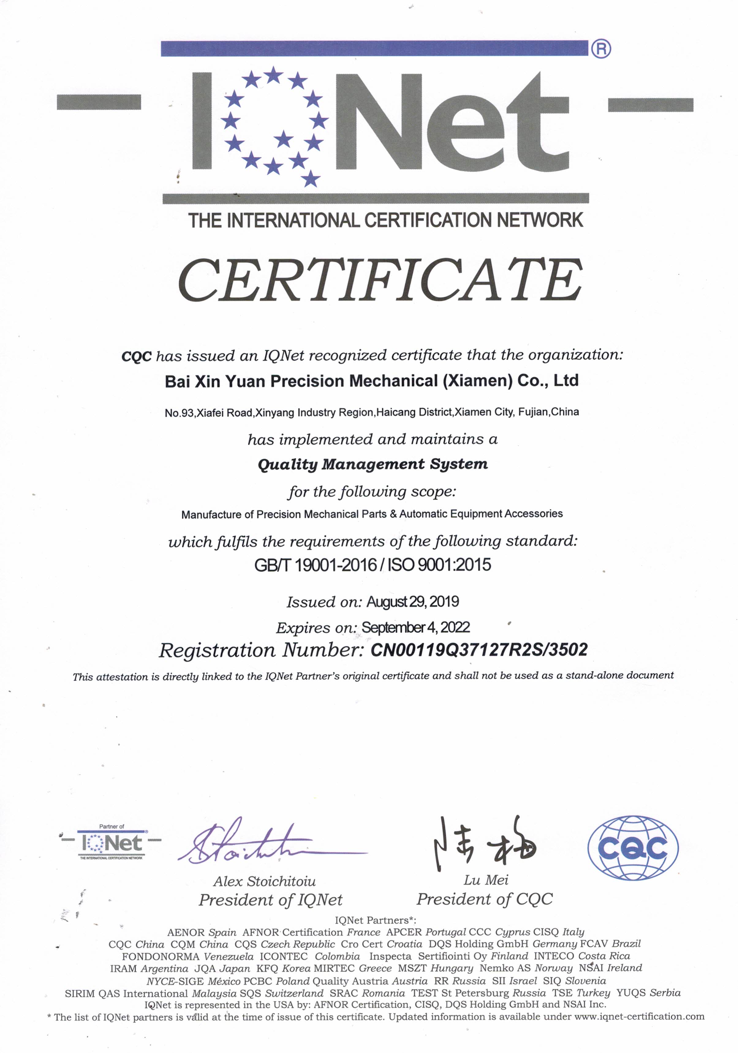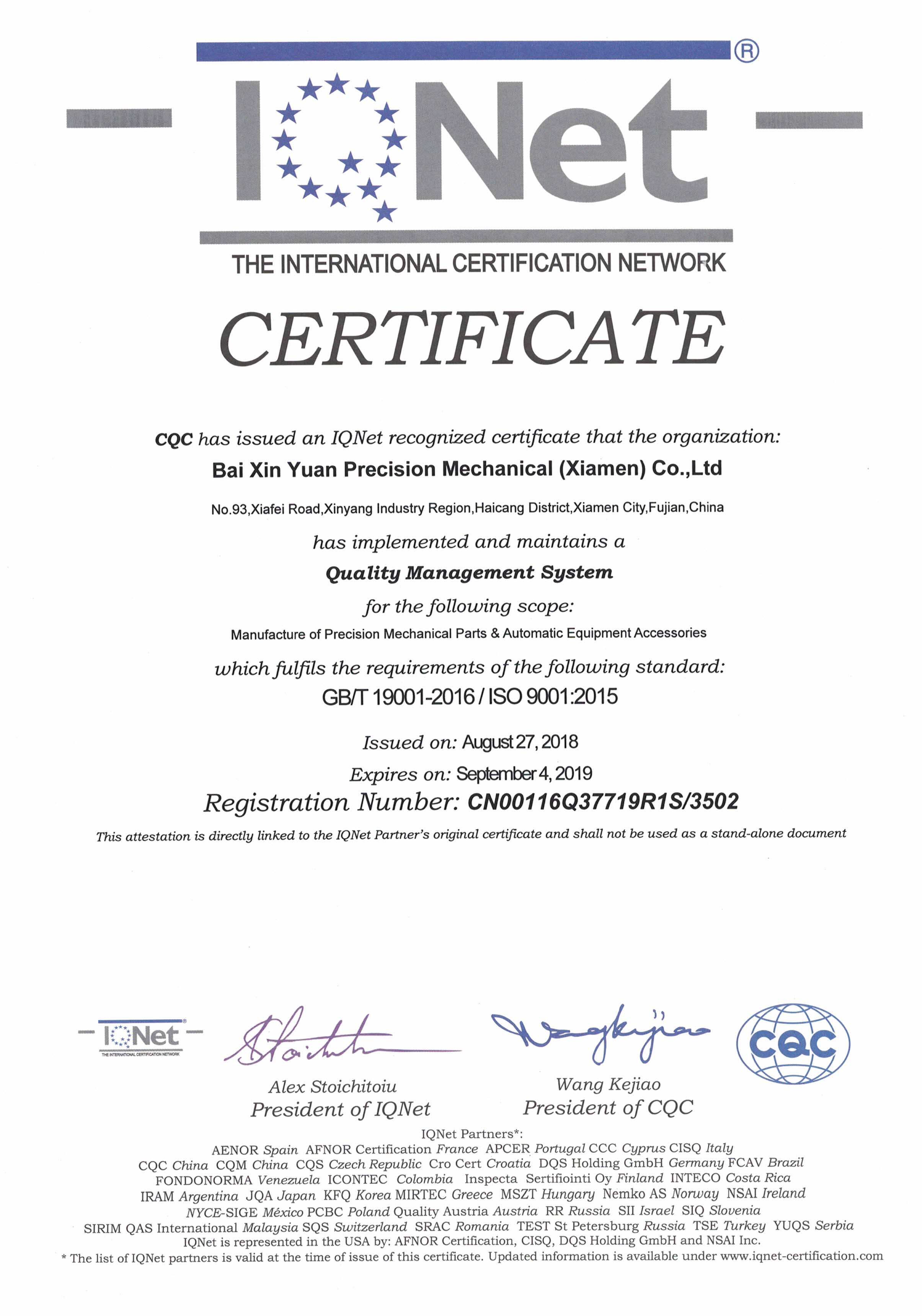 ●2019年8月佰鑫源公司再次获得ISO9001:2015质量体系认证
